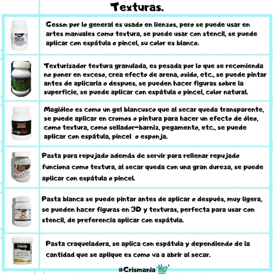Texturizador granulado: Si buscan un efecto de arena o de algo oxidado y antiguo, este es el suyo. Es una pasta pesada que crea figuras con mucho relieve, y lo mejor es que pueden pintarla antes o después de aplicarla.